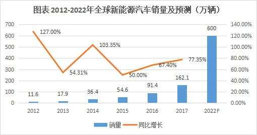 在此背景下,全球新能源汽車銷售量從2011年的5.1萬輛增長至2017年的1621萬輛,6年時間銷量增長30.8倍。未來隨著支持政策持續(xù)推動、技術進步、消費者習慣改變、配套設施普及等因素影響不斷深入,GGI預計2022年全球新能源汽車銷量將達到600萬輛,相比2017年增長2.7倍。