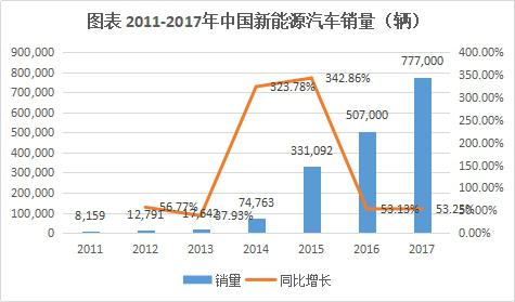 2017年,鋰離子電池主要應用市場增速放緩,全年全球鋰離子電池產業(yè)規(guī)模超過3000億人民幣,增速較2016年下滑4個百分點。在新能源汽車推廣政策繼續(xù)推動下,2017年中國電動汽車產量達到65萬輛,在全球電動汽車市場占比將進一步提升。