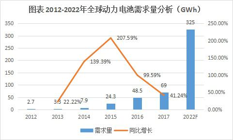 2017年全球應用于電動汽車動力電源規(guī)模為69.0GWh,是消費電子、動力、儲能三大板塊中增量最大的板塊。GGII預計到2022年全球電動汽車鋰電池需求量將超過325GWh,相比2017年增長3.7倍。