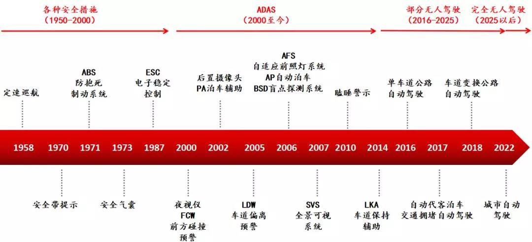 無人駕駛技術(shù)最初的發(fā)展從減少、防止機動車事故開始。從1950年至2000年,OEM車廠和Tier 1的零部件制造商對車輛發(fā)明、生產(chǎn)了許多結(jié)構(gòu)性的改進。最核心的就是四大安全系統(tǒng):安全帶,防抱死制動系統(tǒng)(ABS),安全氣囊和電子穩(wěn)定控制(ESC)。