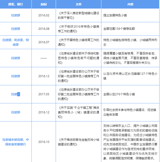 2016年以來,國家發(fā)改委、住建部聯(lián)合多個(gè)銀行出臺(tái)多項(xiàng)支持特色小鎮(zhèn)建設(shè)的政策文件及金融支持文件。