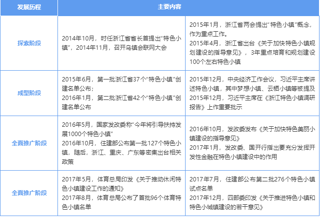 改革開放以來,我國特色小鎮(zhèn)經(jīng)歷了三個(gè)發(fā)展階段:第一階段即探索階段,2014年浙江省省長李強(qiáng)首提“特色小鎮(zhèn)”;第二階段為成型階段,習(xí)近平在《浙江特色小鎮(zhèn)調(diào)研報(bào)告》上做了重要批示;第三階段為全面推廣階段,這個(gè)階段特點(diǎn)為國家發(fā)布引導(dǎo)政策,隨后地方政策密集出臺(tái),全國各地特色小鎮(zhèn)建設(shè)如火如荼。