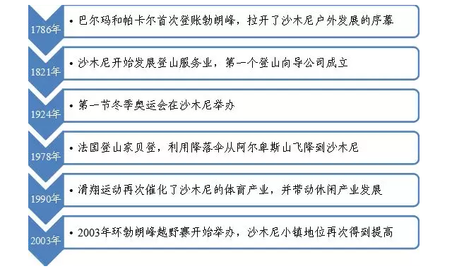 沙木尼的作為特色小鎮(zhèn)的最初起源,來自1786年8月當(dāng)?shù)孬C人巴爾瑪和醫(yī)生帕卡爾兩人首次登上勃朗峰;1821年開始,沙木尼開始發(fā)展登山服務(wù)業(yè),小鎮(zhèn)內(nèi)34名的本地向?qū)ЫM成了一個(gè)向?qū)Ч荆?924年第一屆冬季奧運(yùn)會(huì)在沙木尼舉辦,世界性的滑雪教練訓(xùn)練中心也在這里落戶。至此,沙木尼的特色小鎮(zhèn)地位已經(jīng)基本