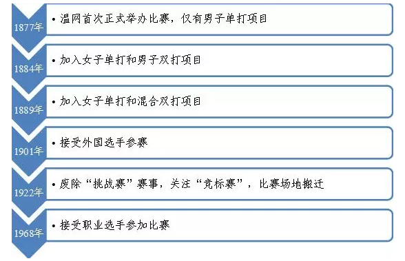 溫網(wǎng)于1877年首次于全英草地網(wǎng)球和門球俱樂部管理之下在溫布爾登Worpl路附近的一塊場地舉行,當(dāng)時(shí)僅有男子單打比賽。1884年,全英俱樂部增加了女子單打和男子雙打比賽,女子雙打和混合雙打則在1889年加入。1922年比賽搬遷到到了如今的Church路場地。如同其他3項(xiàng)“大滿貫”賽事,溫布爾登在1968年網(wǎng)球公開時(shí)代到來之前,只對頂級(jí)的業(yè)余選手開放。而之后,溫網(wǎng)是所有職業(yè)選手的圣地。