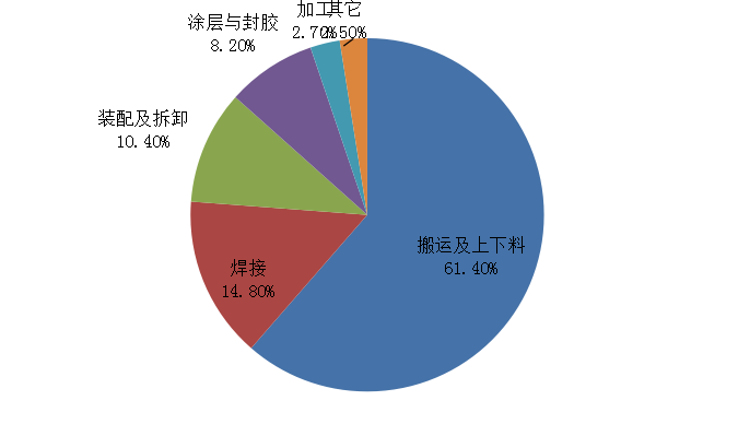 在國(guó)產(chǎn)工業(yè)機(jī)器人市場(chǎng)中,搬運(yùn)及上下料銷量同比增長(zhǎng)40.8%,占比達(dá)61.4%;焊接銷量同比增長(zhǎng)9.7%,占比達(dá)14.8%;裝配及拆卸銷量同比增長(zhǎng)5.4%,占比達(dá)10.4%。