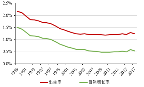另一方面,中國(guó)近年來(lái)的人口出生率和自然增長(zhǎng)率也呈現(xiàn)不斷下降的趨勢(shì),2017年比2016年出生人口減少了63萬(wàn)人,人口出生率僅為12.4‰,同比降低0.5‰,這一數(shù)據(jù)比日本的出生率還要低。我國(guó)的人口自然增長(zhǎng)率更是下降到5.3‰,長(zhǎng)期的低生育水平直接加大了對(duì)未來(lái)我國(guó)勞動(dòng)力不足的擔(dān)憂。