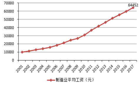 除了未來(lái)勞動(dòng)力不足之外,中國(guó)制造業(yè)員工的平均工資則呈現(xiàn)逐年增長(zhǎng)的態(tài)勢(shì),2017年已升至64452元,同比增長(zhǎng)8.4%。勞動(dòng)力成本不斷上升,用機(jī)器人代替人工也是更加經(jīng)濟(jì)、符合市場(chǎng)規(guī)律的必然選擇。目前,“世界工廠”正不斷的從中國(guó)向東南亞等其他國(guó)家和地區(qū)轉(zhuǎn)移,中國(guó)改革開(kāi)放初期借助人口紅利快速發(fā)展的條件已然不復(fù)存在。解決勞動(dòng)力不足、勞動(dòng)力成本上升的主要途徑就是智能制造,即生產(chǎn)過(guò)程的自動(dòng)化、智能化產(chǎn)業(yè)升級(jí)。未來(lái)通過(guò)產(chǎn)業(yè)的轉(zhuǎn)型升級(jí)更加注重質(zhì)量和效益的提升,“機(jī)器代人”的生產(chǎn)方式將會(huì)更加普遍。