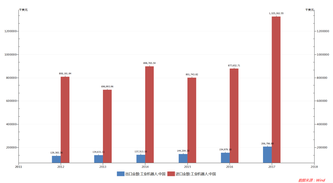 中國(guó)工業(yè)機(jī)器人進(jìn)出口金額(萬(wàn)美元)