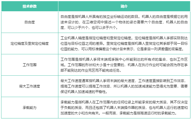 工業(yè)機(jī)器人的主要技術(shù)參數(shù)一般有自由度、定位精度及重復(fù)定位精度、工作范圍、最大工作速度和承載能力等。這些參數(shù)是工業(yè)機(jī)器人本體制造過(guò)程中重要的考量指標(biāo),是衡量一家廠商本體制造水平高低的標(biāo)準(zhǔn)。