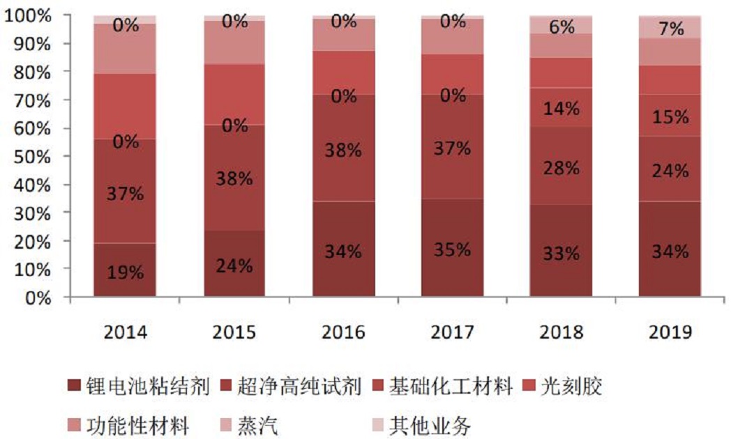 2018年,公司實(shí)現(xiàn)營(yíng)業(yè)收入14.46億元,同比增長(zhǎng)76.23%,實(shí)現(xiàn)歸母凈利潤(rùn)2.84億元,同比增長(zhǎng)239.37%。其中電子化學(xué)品占公司總營(yíng)收的64.9%,是公司最主要的收入來源。