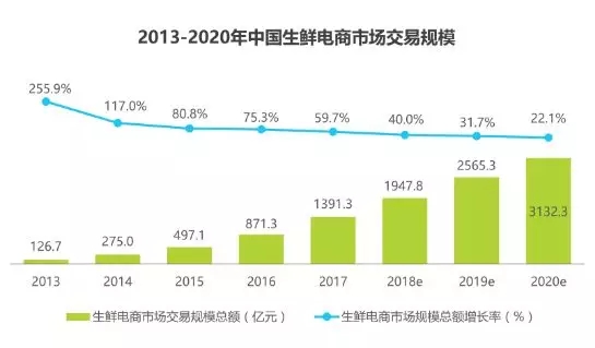 2017年中國生鮮電商市場交易規(guī)模約為1391.3億元,同比增長59.7%,預(yù)計2020年,生鮮電商交易規(guī)??梢赃_(dá)到3132億元。一方面基于消 費(fèi)者消費(fèi)習(xí)慣養(yǎng)成,另一方面基于冷鏈和倉儲系統(tǒng)迅速完善。