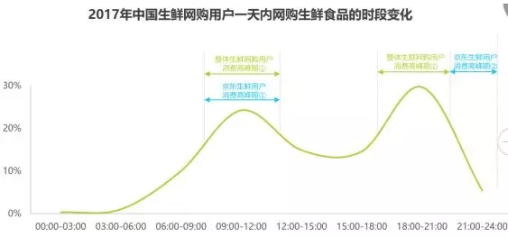 18:00-21:00是生鮮食品的消費(fèi)集中段,用戶根據(jù)需求的即時性選擇不同的平臺購買生鮮食品。