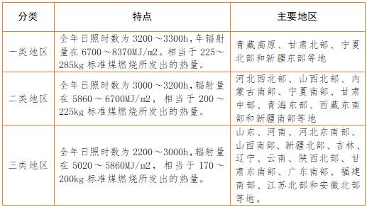 太陽能資源的分布與各地的緯度、海拔高度、自然地理狀況和氣候條件有關(guān)。我國屬太陽能資源豐富的國家之一,全國總面積2/3以上地區(qū)年日照時數(shù)大于2000h,根據(jù)中國氣象局風(fēng)能太陽能評估中心推薦的國內(nèi)太陽能資源地區(qū)分類辦法,共分5類,其中: